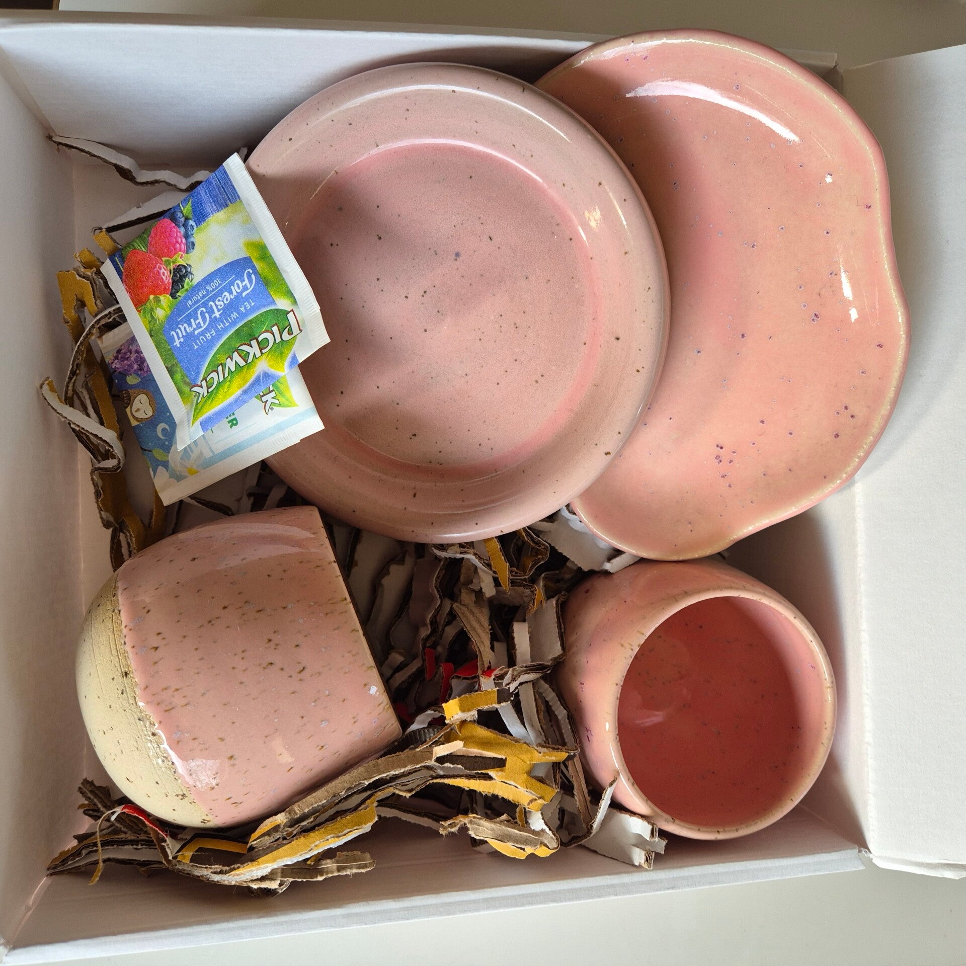 Deze handgemaakte tea for two theebox in keramiek bestaat uit een 2 bolle kopjes in spikkelklei, een onderbordje en een klein donutbordje, vervaardigd uit duurzaam steengoed. De set combineert functionaliteit met een zachte, eigentijdse uitstraling en is ontworpen voor dagelijks gebruik.
