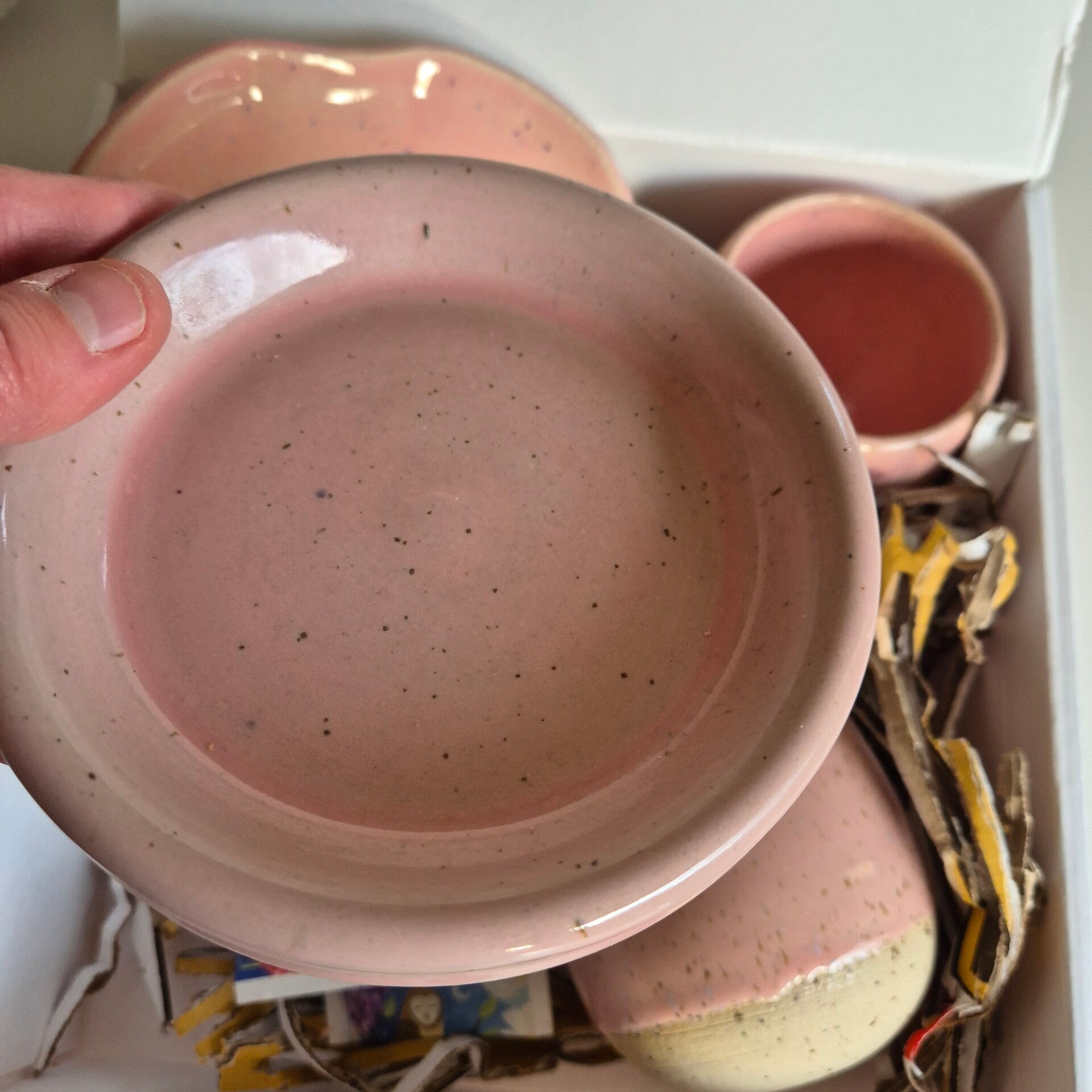 Alle stukken zijn geglazuurd in een zachtroze glazuur met subtiele spikkels wat zorgt voor een warm kleuraccent.